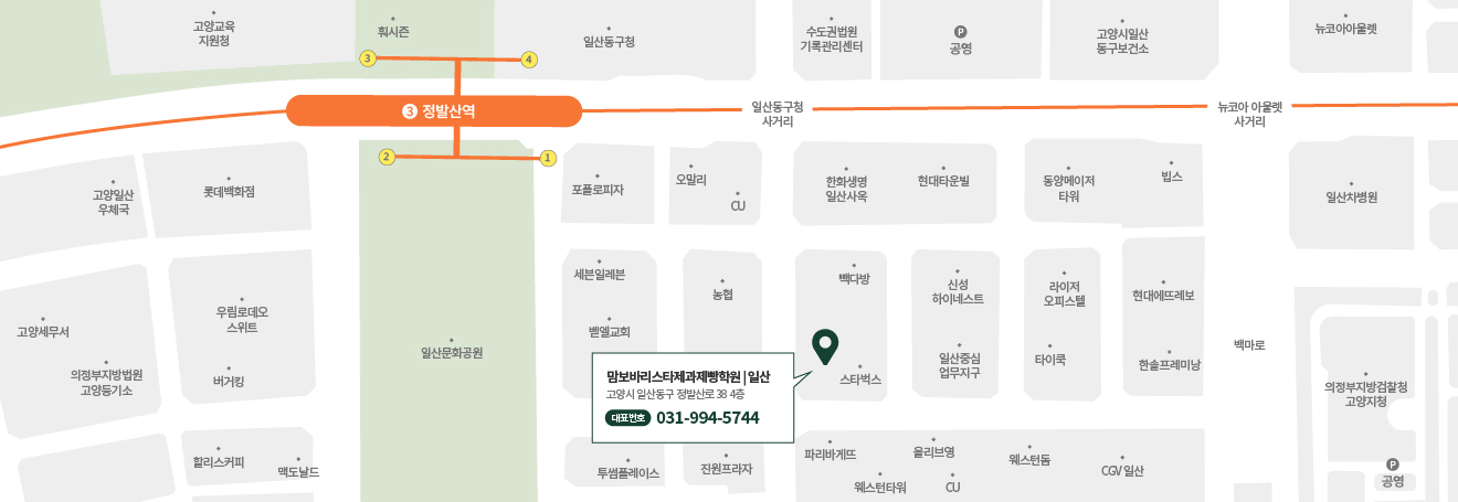 3호선 정발산역 1번출구에서 도보 5분거리에 위치하고 있습니다.